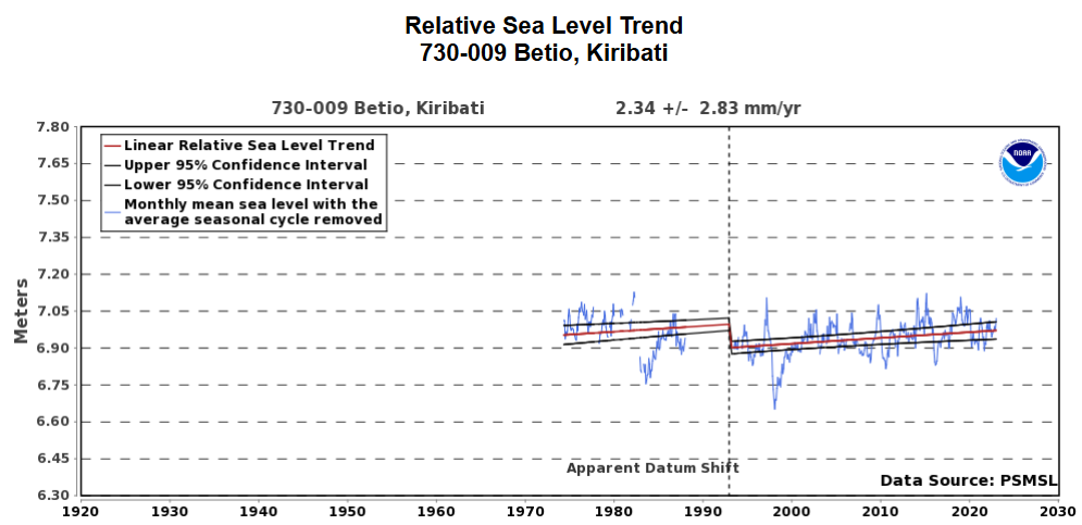 This is not a fringe view. Climate Realism has repeatedly documented how media outlets ignore these findings, including in its coverage collected under island and sea-level rise reporting, where studies showing island growth in places like Tuvalu, the Marshall Islands, and Kiribati are contrasted with alarmist headlines predicting imminent disappearance. Those empirical studies directly contradict New Scientist’s framing of inevitability and catastrophe. Further, sea level rise data from NOAA on the island of Kirbati is quite modest, just 0.77 feet per century.